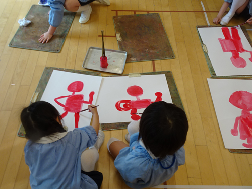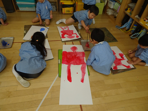 今日は身体の特徴を捉えて、水彩えのぐで輪郭を描いていました。