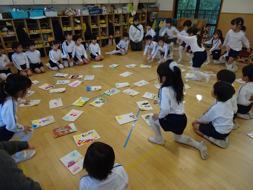 年長さんも劇遊びにかかわる活動もしていますが、大型カルタで遊びました。