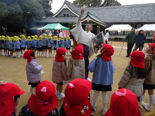 年長さんは加えてみんなでつくったクラスの注連縄を納めました。