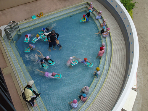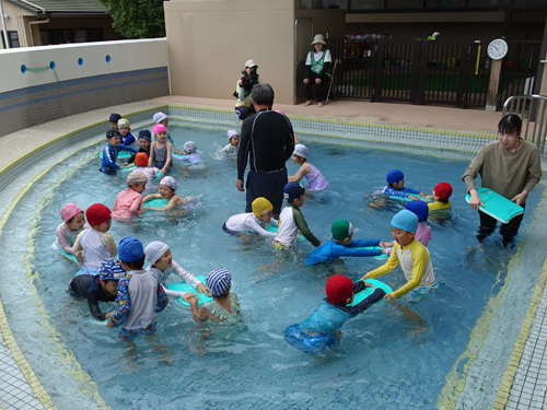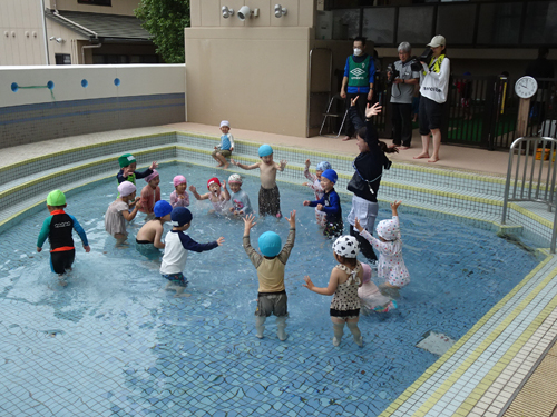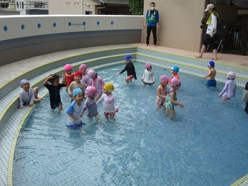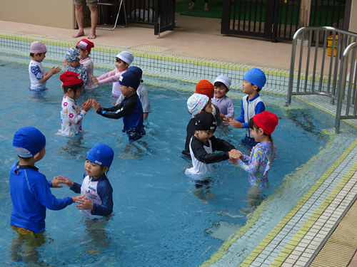 年少さんにとっては、初めてのプール保育。楽しそうに水に親しんでいました。