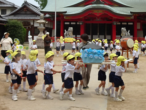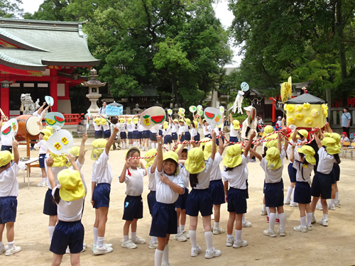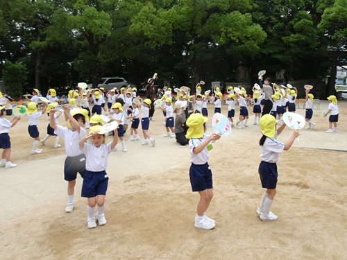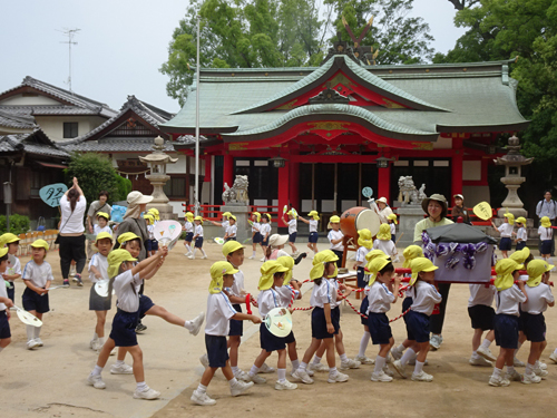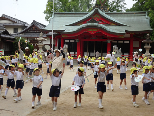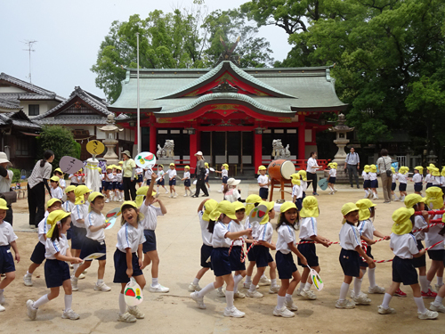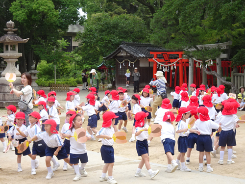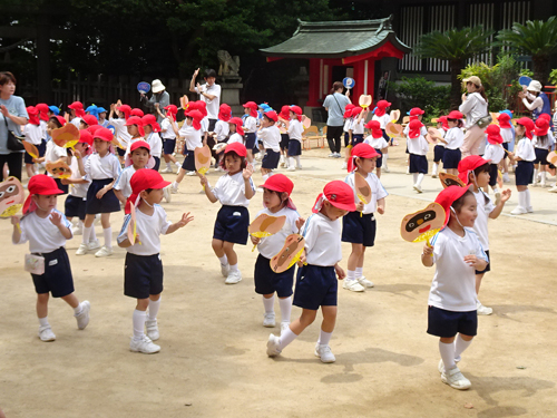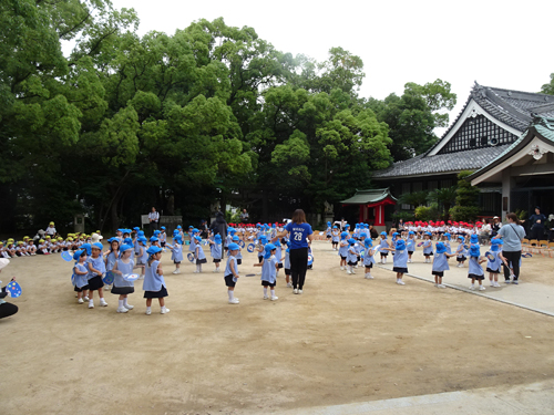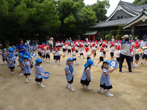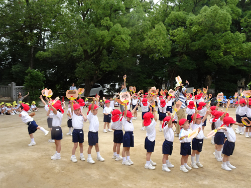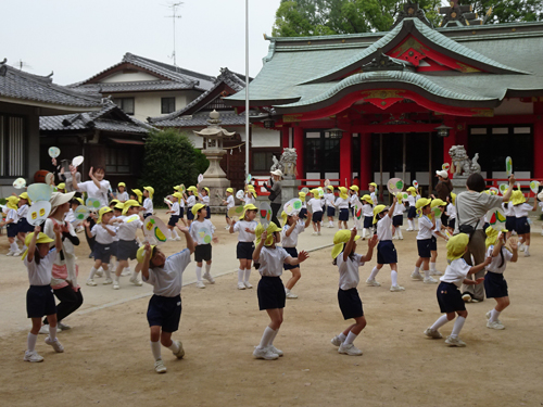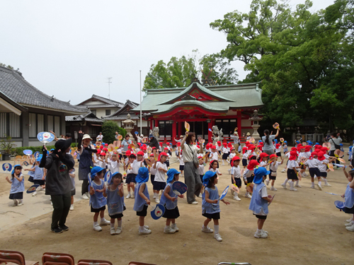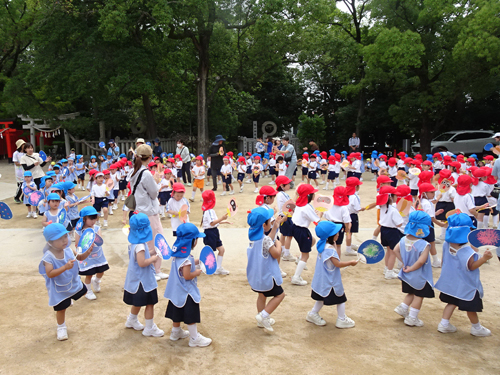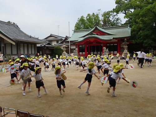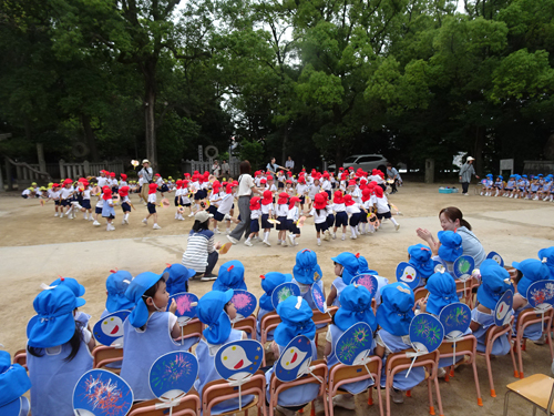 最後は学年全体で二重円になって、前々園長先生が作詞、音楽講師の小林先生が作曲された「亀之森音頭」を踊りました。