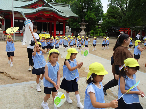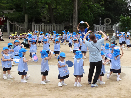 年長さんは七夕まつりに向けての活動を境内で行いました。