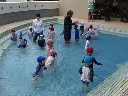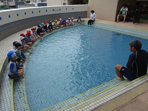園長先生が話すプール保育の時のお約束を真剣に聴いていました。