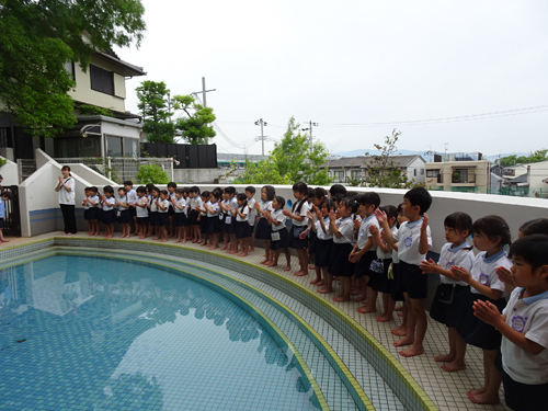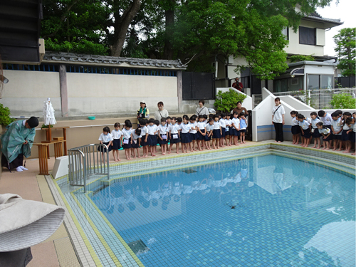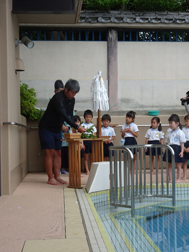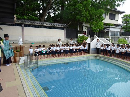 年長さんがプールサイドに参列して、神職の園長先生によりプール開きの神事が行われました。