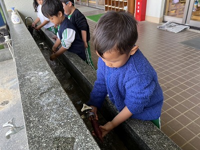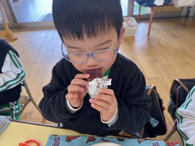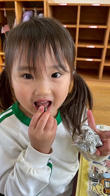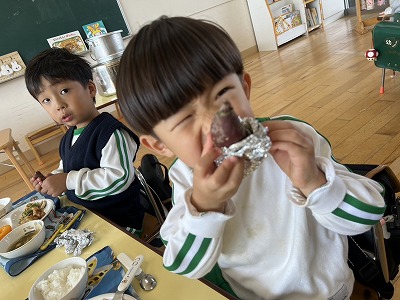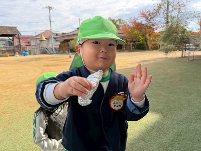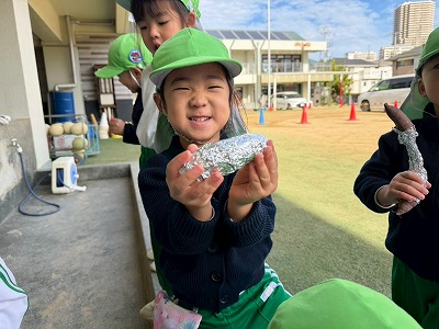 焼いもは自分たちで芋を洗って、アルミホイルで巻きました。その後給食の先生に焼いもにしてもらいました。