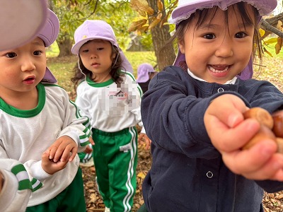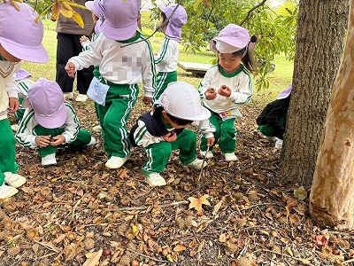 持ってきた袋にどんぐりや落ち葉をどんどん入れて、袋がいっぱいになると「みてみて!こんなに集まったよ!」と、とびきりの笑顔で見せてくれました。