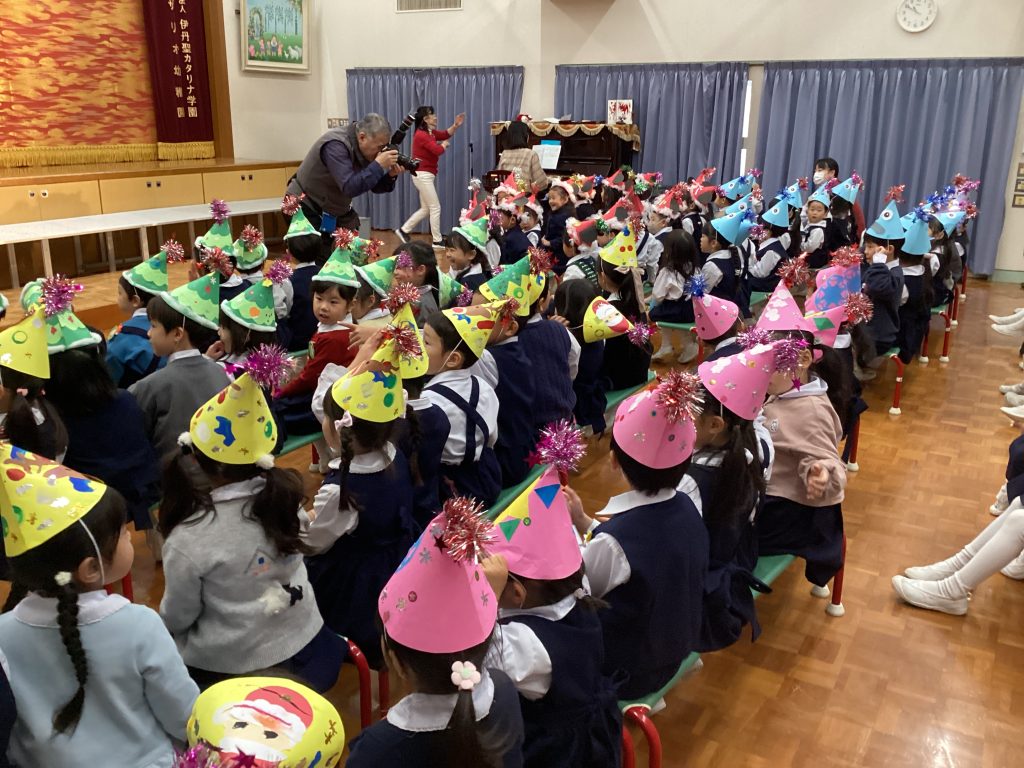 三角帽子を被った子ども達は、「楽しみ~」「早くサンタさん来ないかな~」などとクリスマス祝賀会を楽しみにしていた姿が見られました!