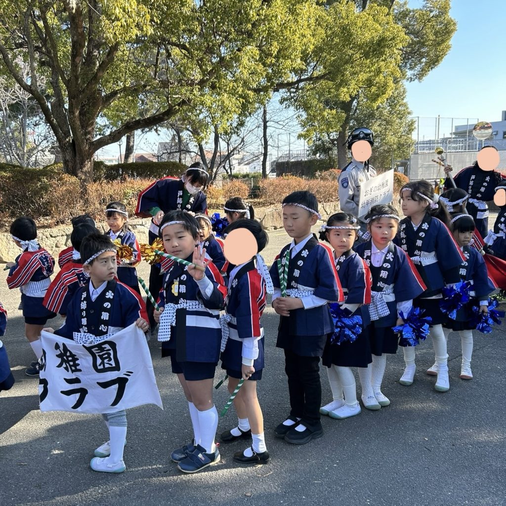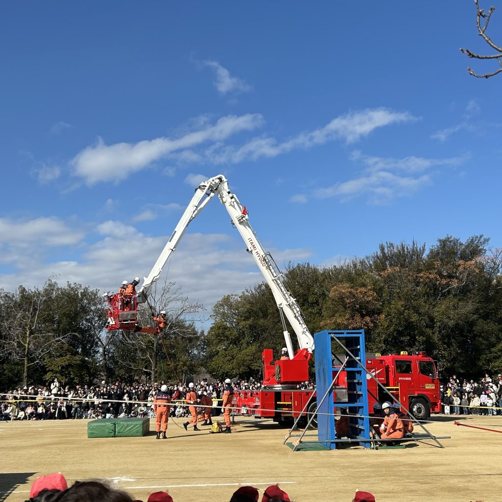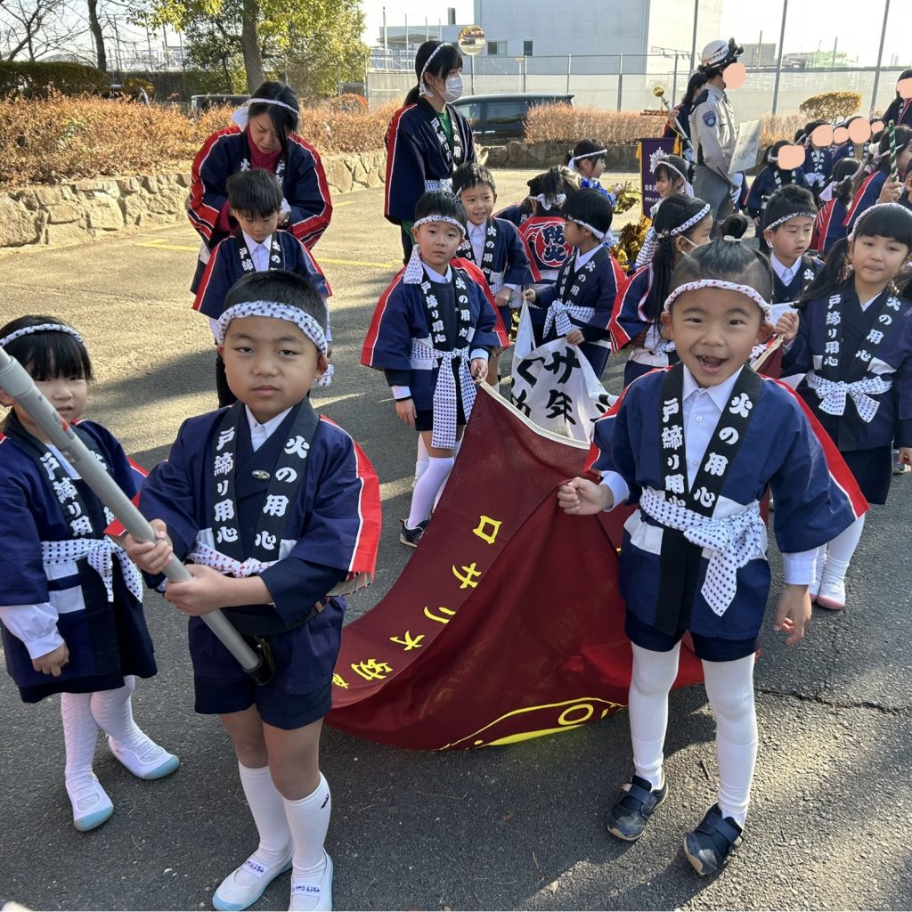 冬晴れの空の下、年長児は伊丹市消防出初式に参加しました。