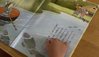 読んでいる本は「一寸法師」です。※石井方式漢字かな交じり絵本