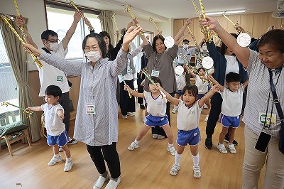 曲の間奏には、赤組と緑組は肩たたきを、黄組は輪になって踊りました。