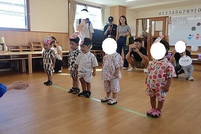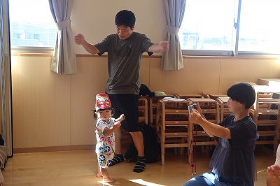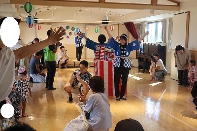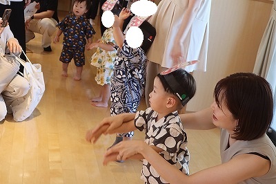 まずは遊戯室に集合して「だるまちゃん音頭」を親子で踊りました。