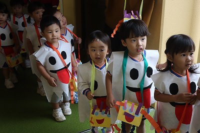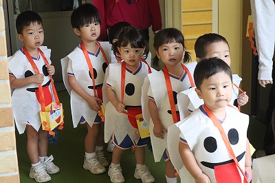 手作りの鞄に、もらったお菓子を入れて持ち帰ります。