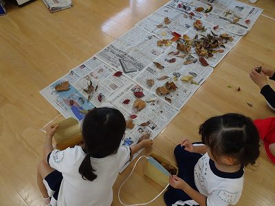 拾ったものを広げ、すぐに「見てーできた!」と、自分のイメージを表現していた子供たちです。