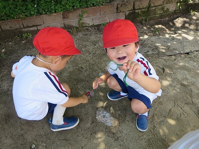 何度も挑戦し、優しく息を吹くと「できた!」と嬉しそうな表情を見ることができました。そして、できたシャボン玉をたくさん追いかけていました。