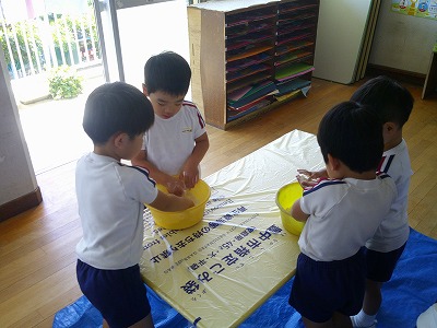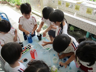 雨が降ったり、暑すぎて外で思い切り遊べない日は、色水も楽しんでいます。