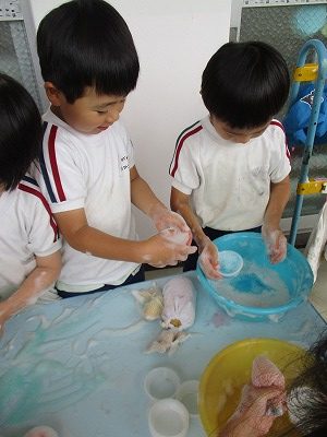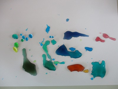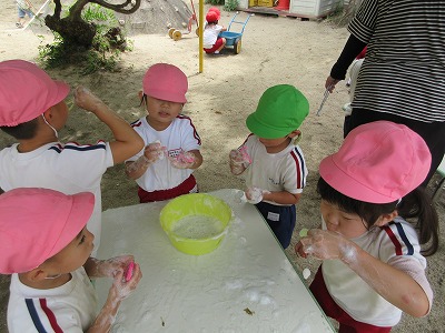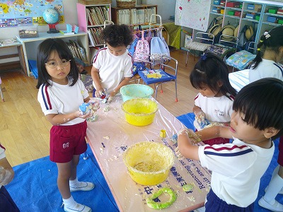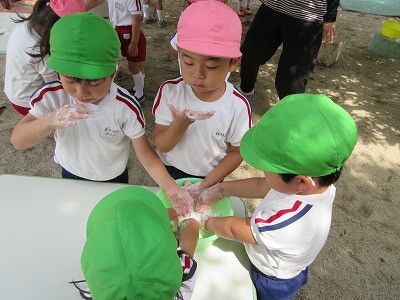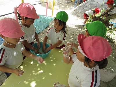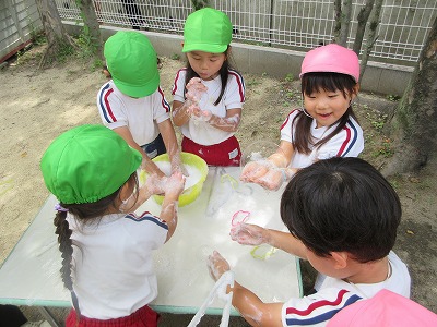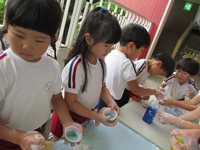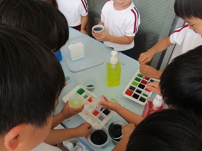 赤・黄・青の色水を混ぜていろんな色を作ったり、泡をのせてソーダやかき氷を作ったり、発想豊かに遊んでいます♪