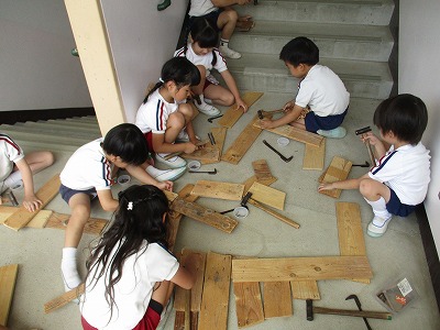 切れた木を釘でつないで、大きな船を作ります!完成が楽しみだね(^^)