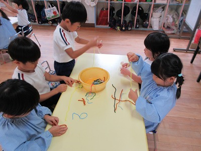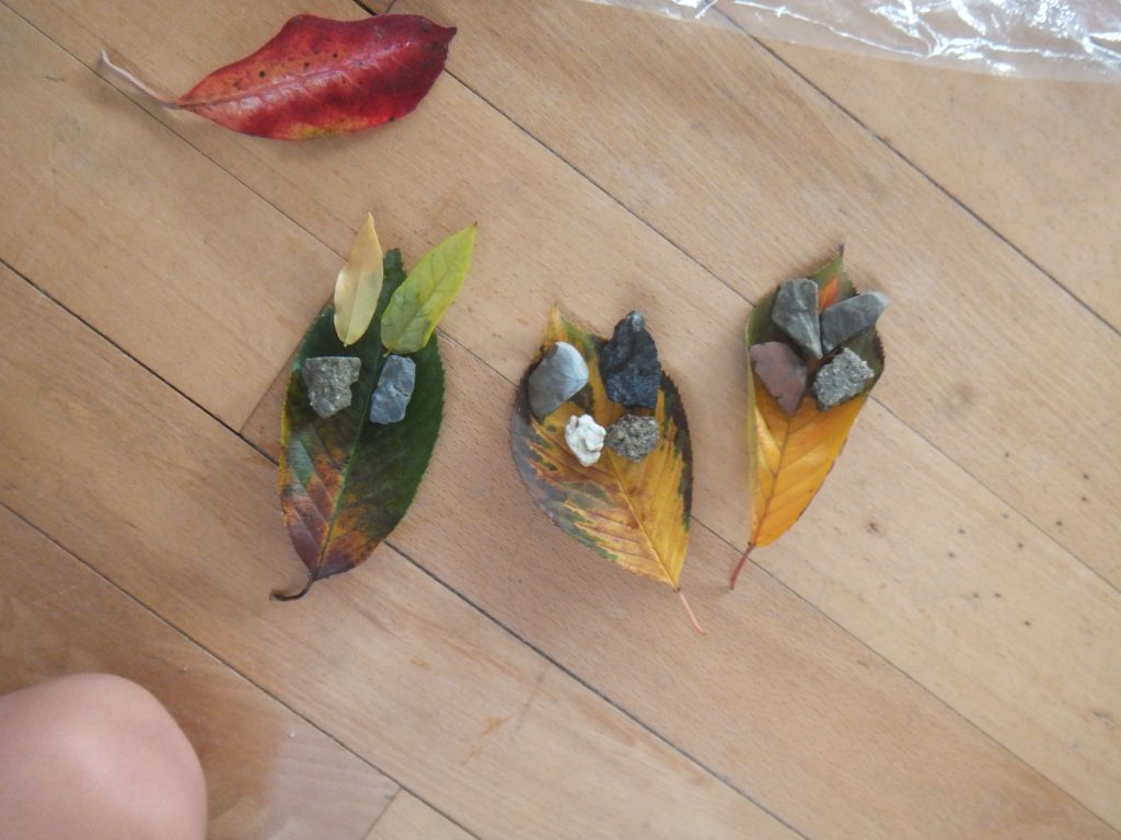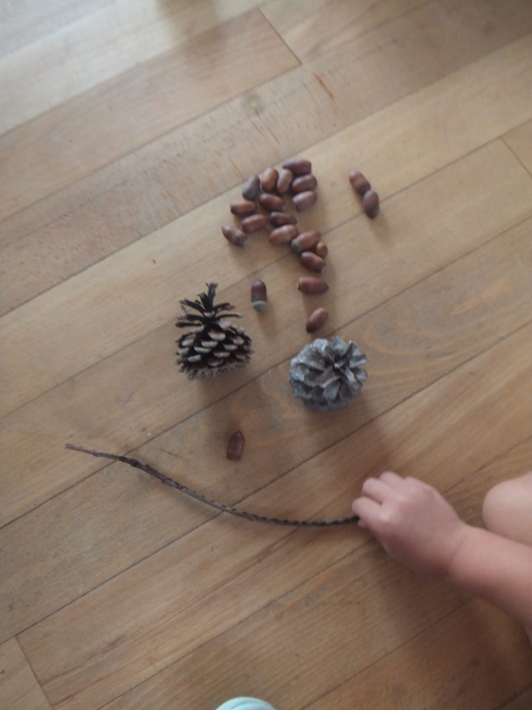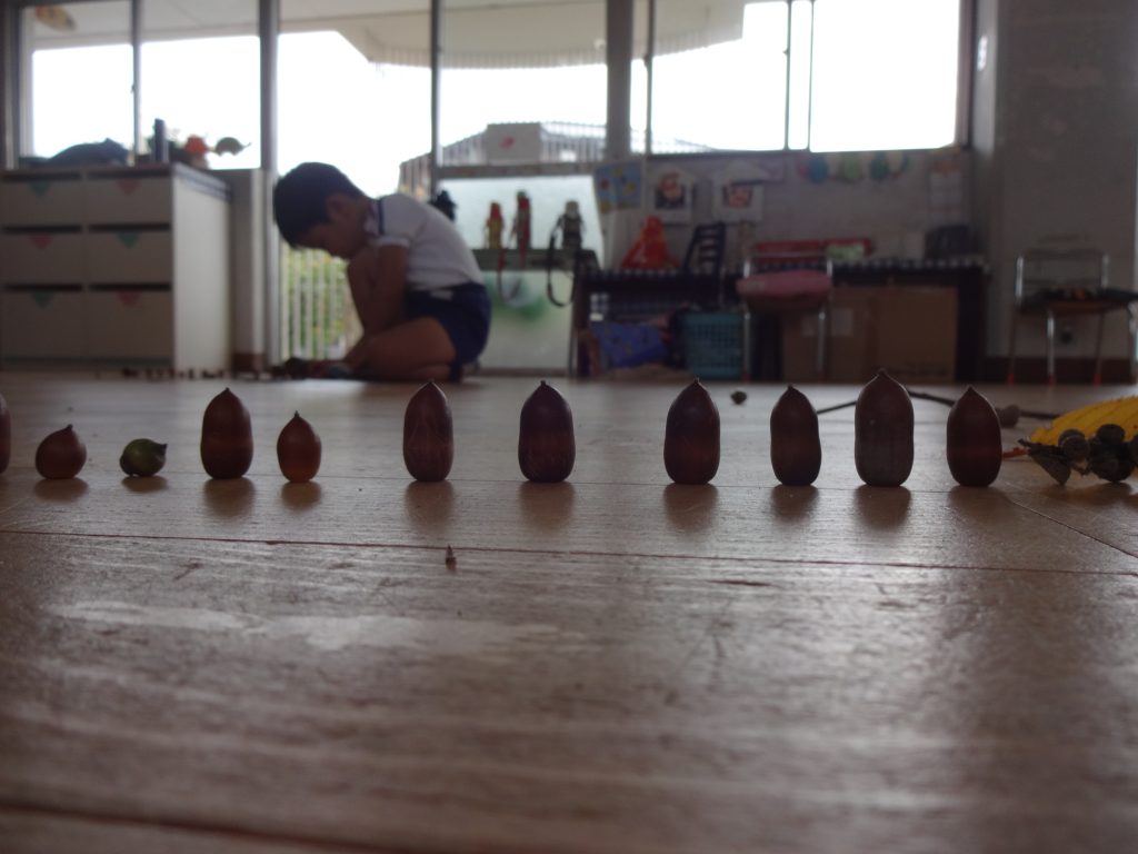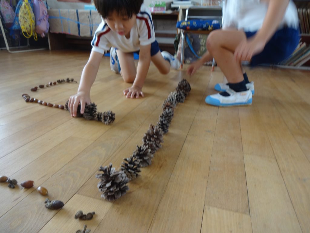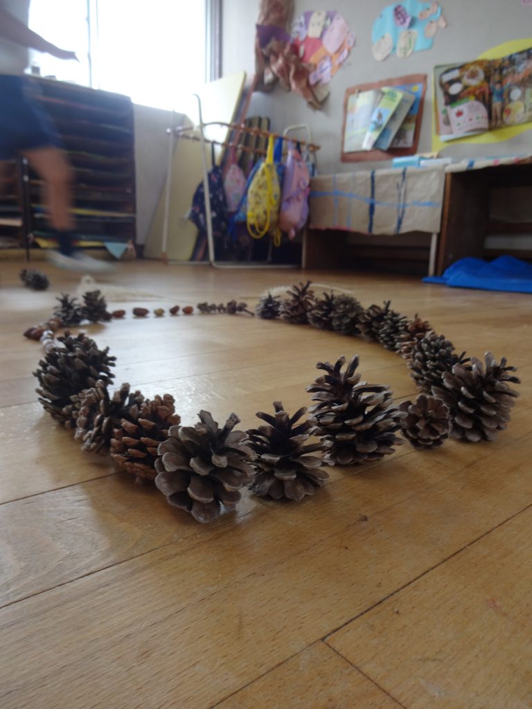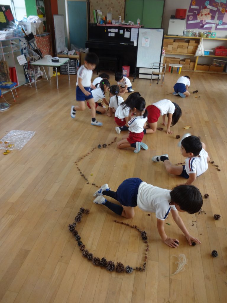 公園でどんぐりやまつぼっくりをみんなが拾ってきてくれ、幼稚園でも落ち葉やススキなど集めました。顔を作ったり、動物を作ったり、繋げてみたり、円にしてみたり、ゲームにしてみたり、子ども達は自然物だけでもたくさんの遊びを見つけていました。