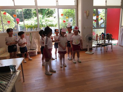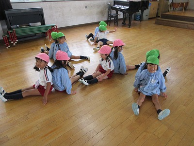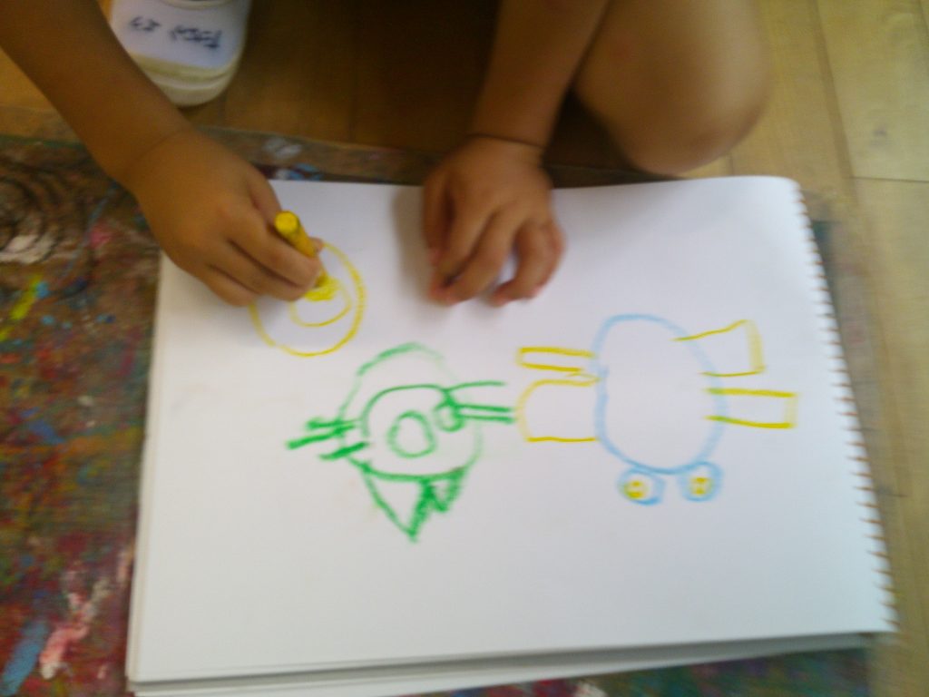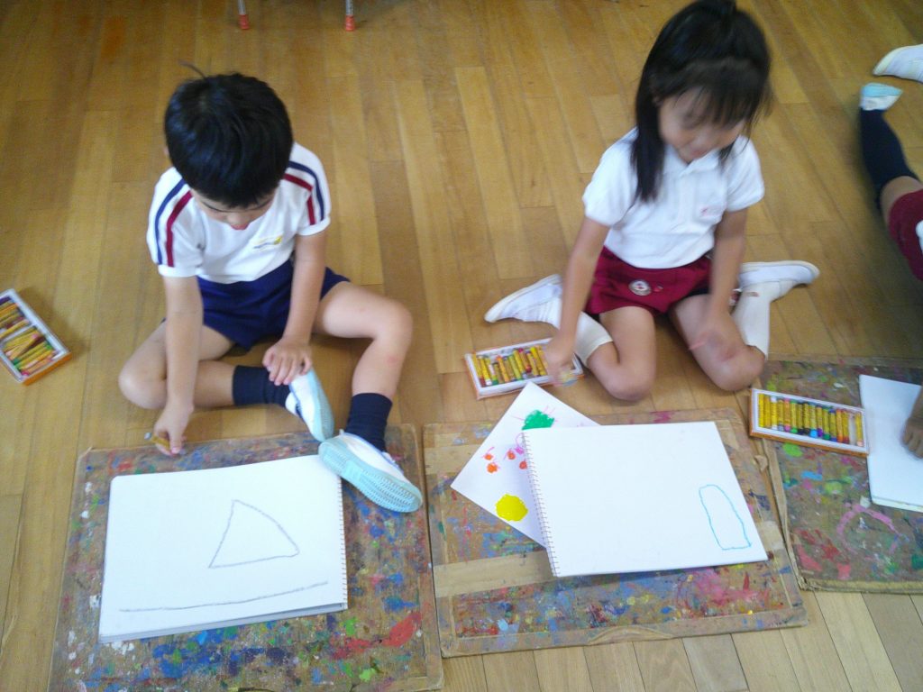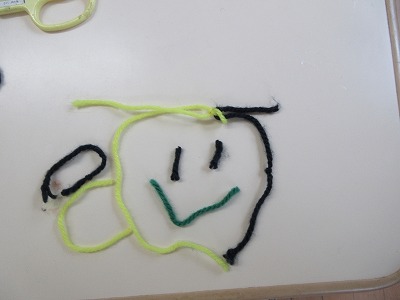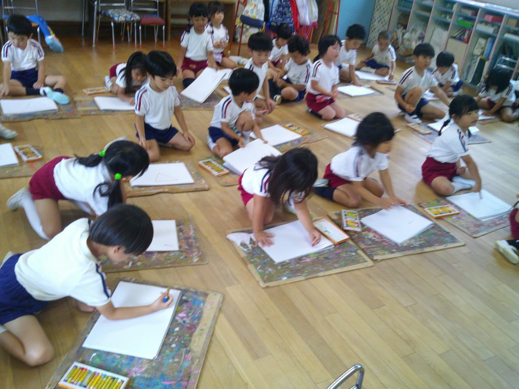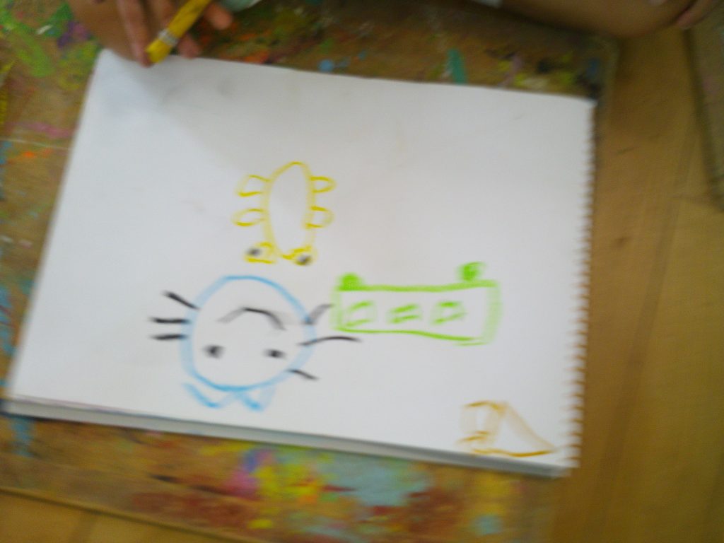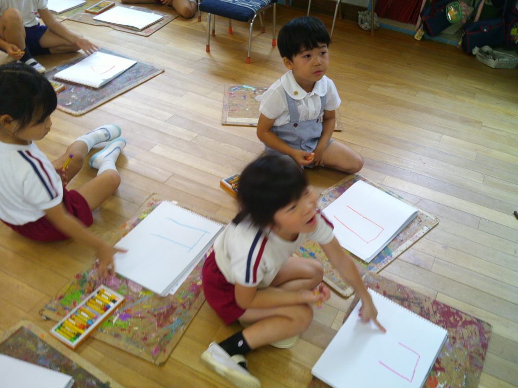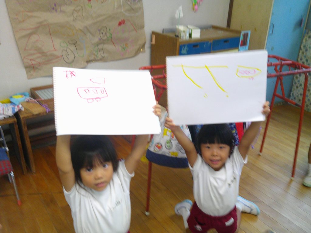 先生のうたや言葉を聞き、描いてみるとかわいい絵や面白い絵ができていました!同じものができるのではなく、それぞれ表現が違い面白かったです。