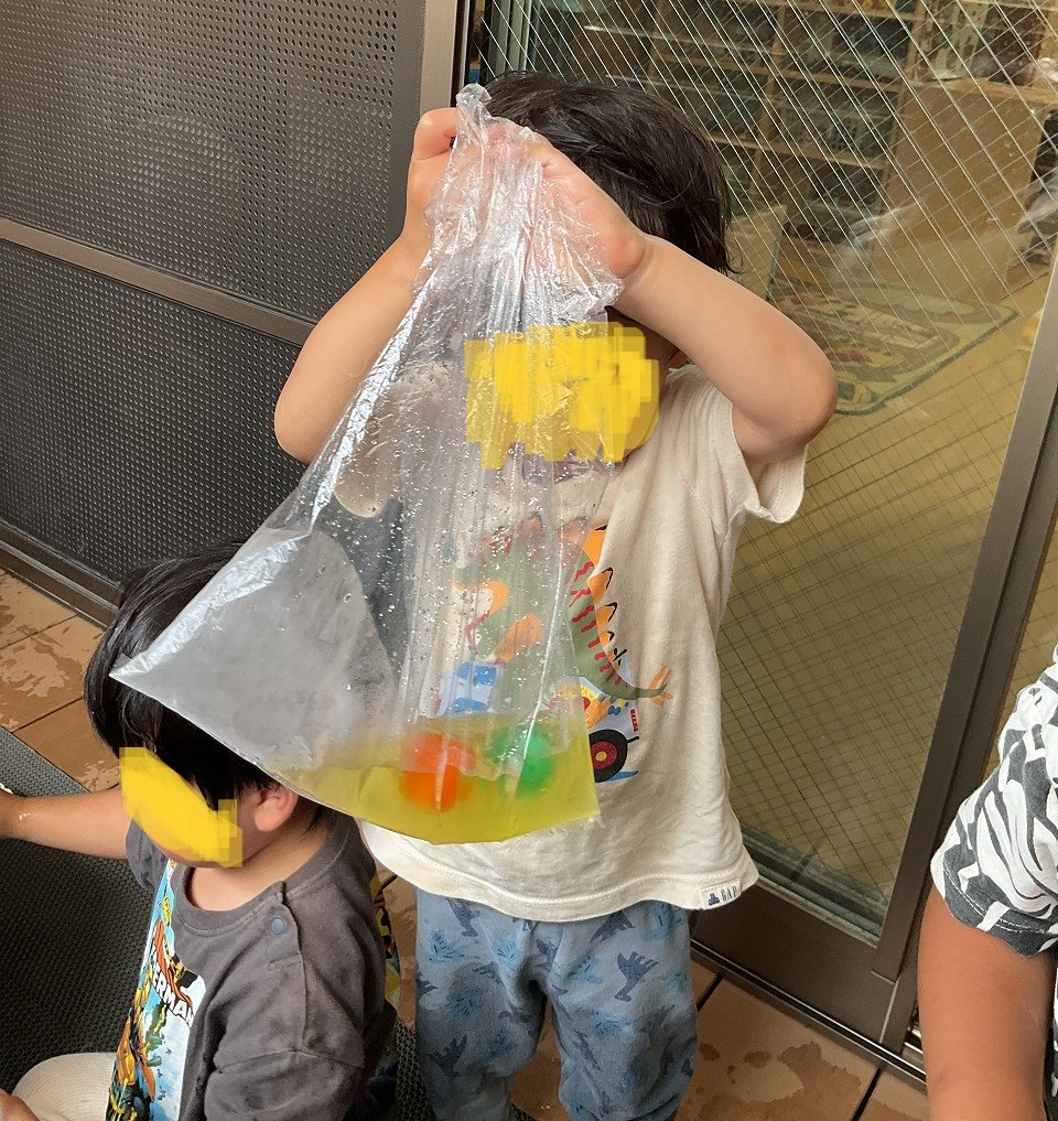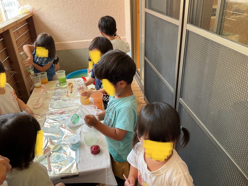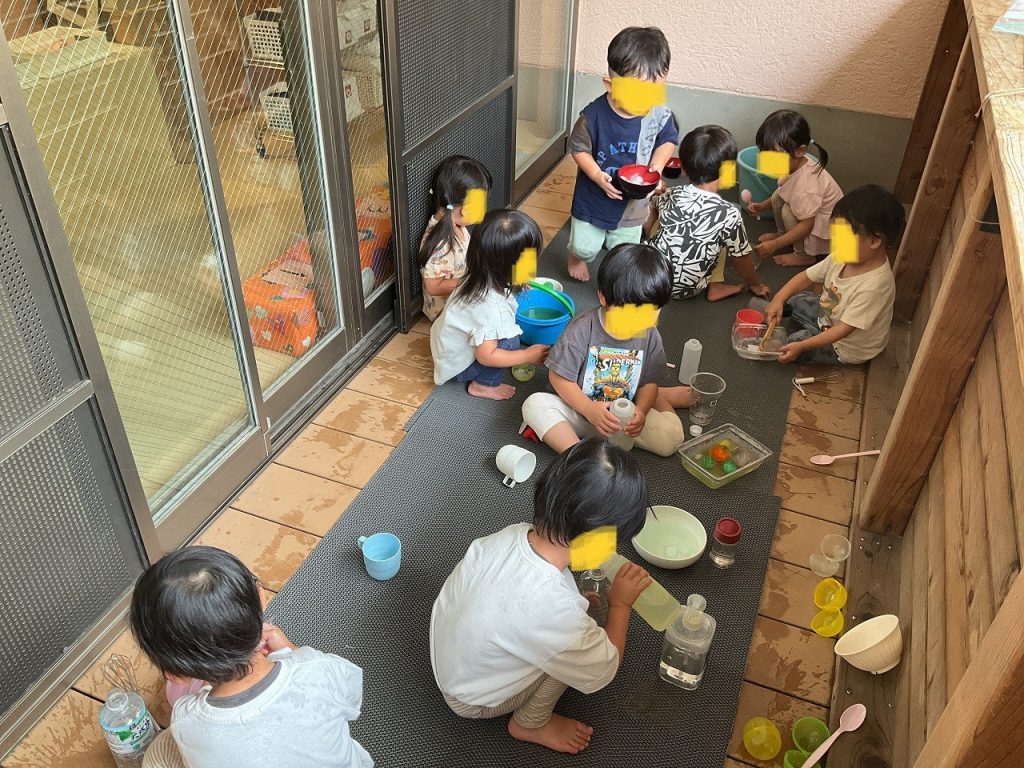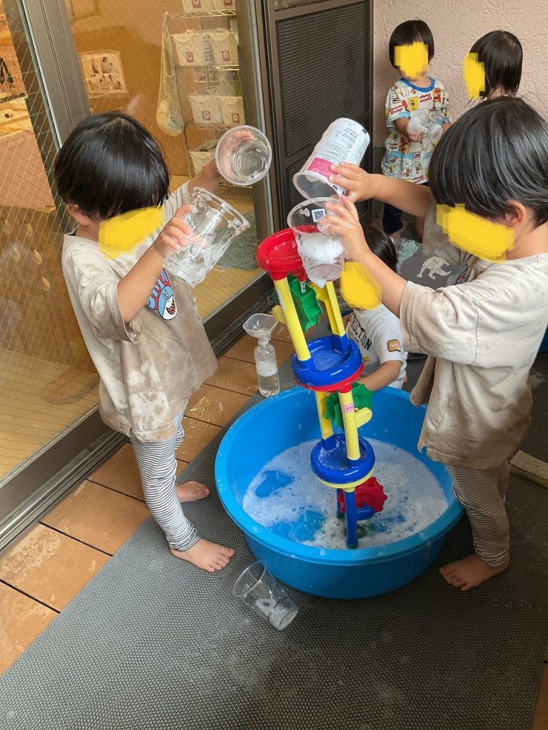 夏のキッズルームのテラスは、水遊びに限らず大盛り上がりです。この日のうさぎぐみさんは、水と色水と泡で実験中の博士のように集中して遊んでいましたよ。混ぜる、泡を作る、配分を調整する、また混ぜる・・・試したり工夫したりいろいろ考えながら、夢中で遊んでいた子どもたちです。