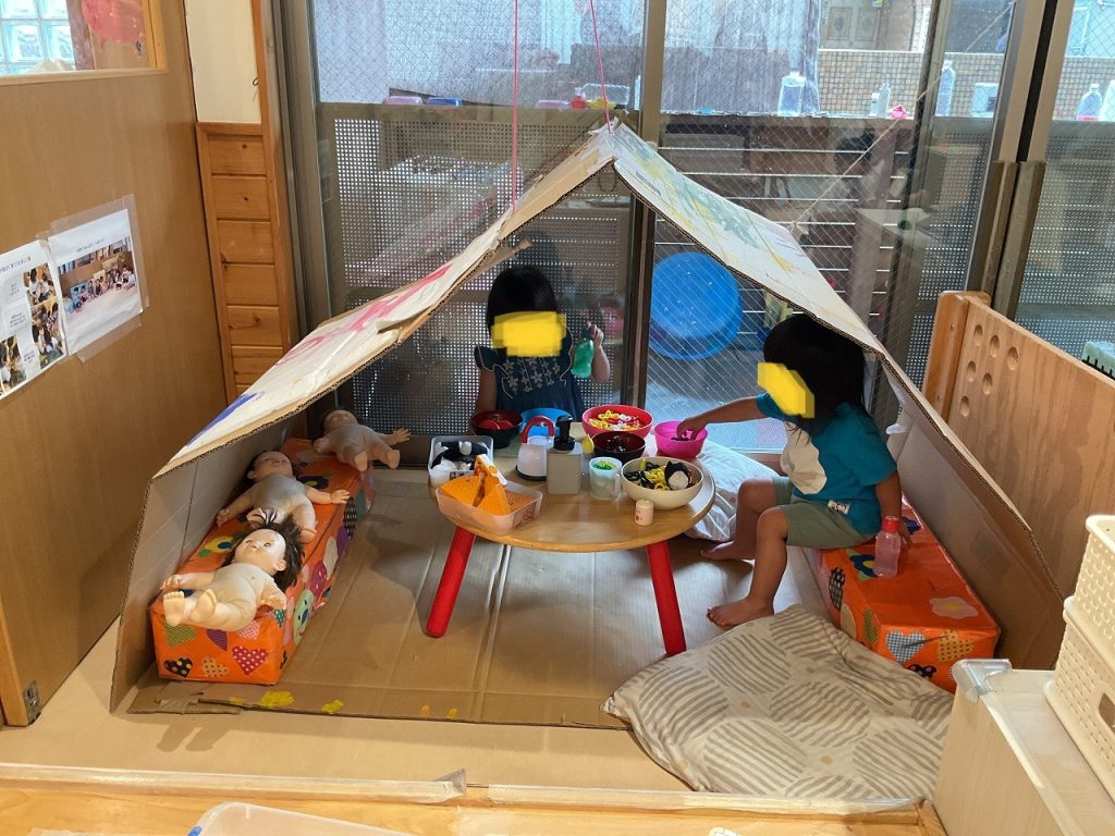 テラスで絵の具遊びをした時の作品を使って、保育士が作ったお家です。赤ちゃん(人形)を連れて、ママさんたちがランチをしている風に見えます(笑)