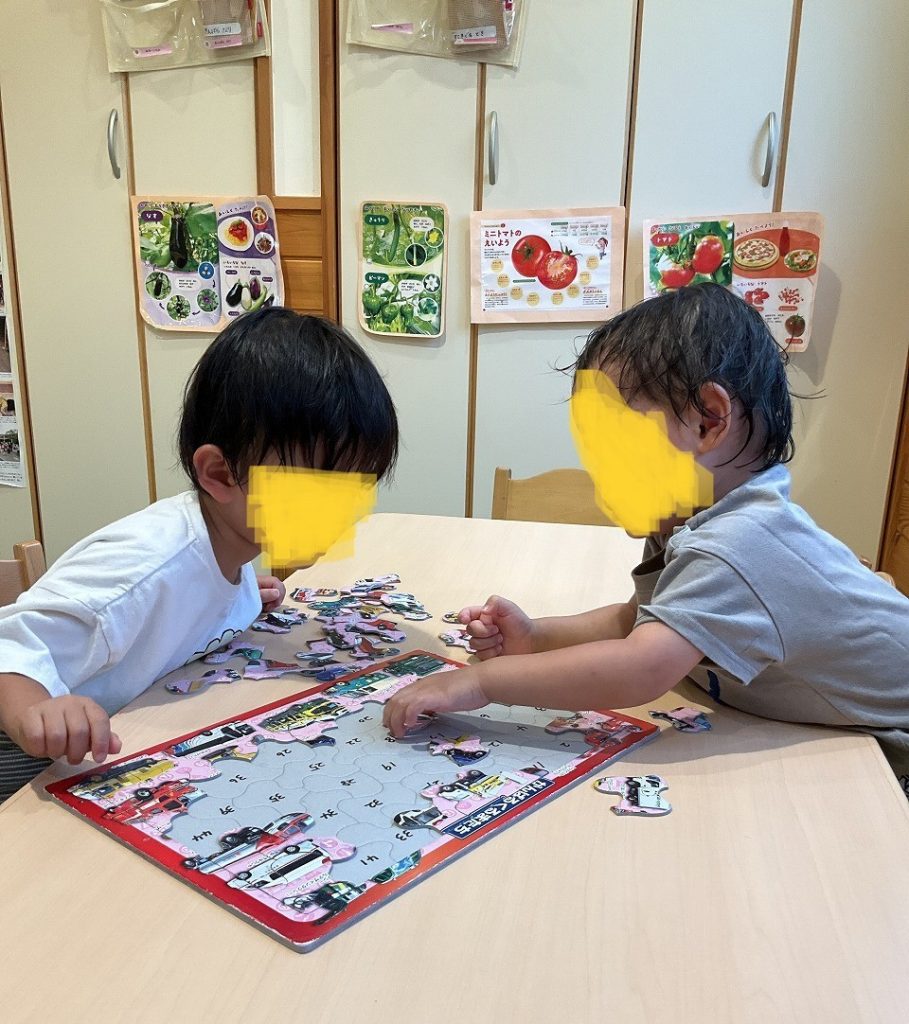 お部屋で涼しく、ゆっくり好きな遊びを楽しんでいるうさぎぐみさん。なかなか難しいパズルに、お友だちと挑戦!