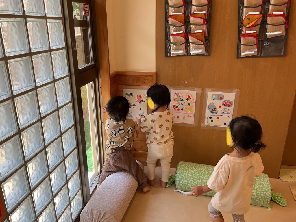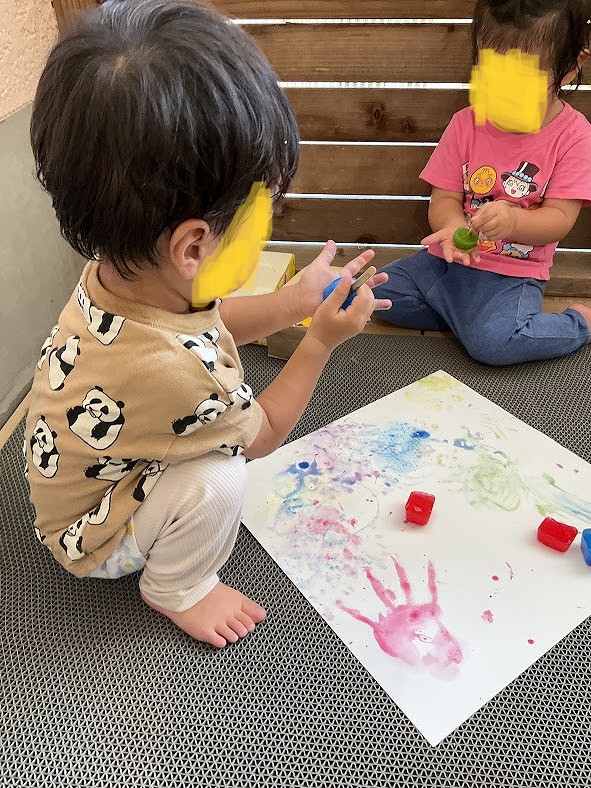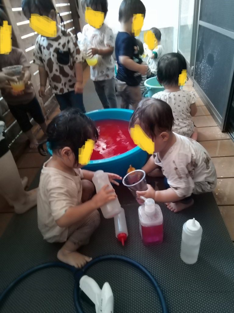 夏のキッズルームのテラスは、毎日水遊びやいろんな感触遊びで大盛り上がり!この日は色水に大興奮のりすぐみさん!
