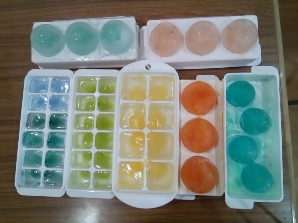 保育士が作った色々な種類の氷です。特に丸い氷は人気があるようです。形や色の種類がいろいろあって、子どもたちが喜びます。