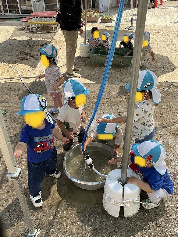園庭には、幼稚園の先生たちの手作りの水遊び場がたくさんあります。穴を開けたホースから出ている水に集まってくる子どもたち。
