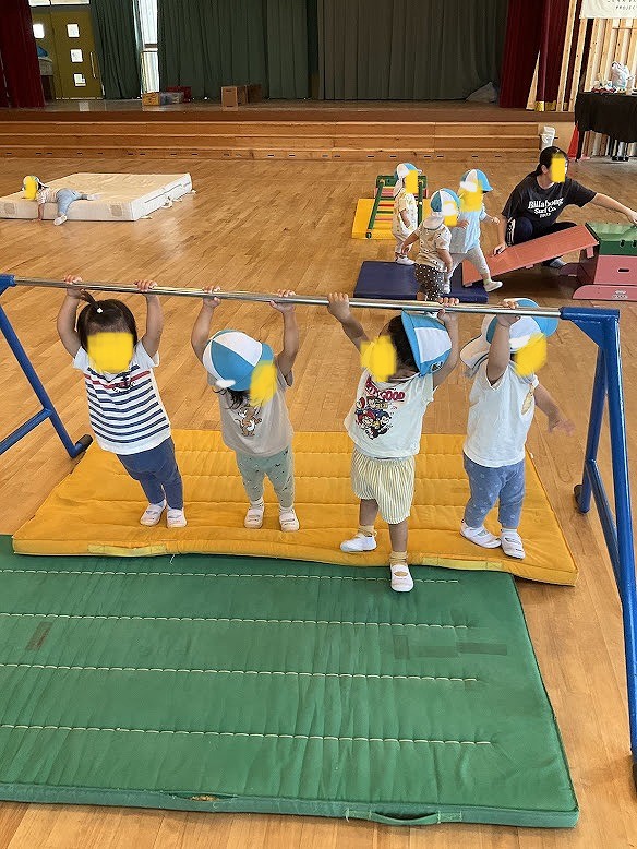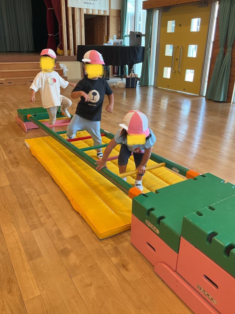 あまりの暑さで戸外遊びは危険です💦でも大丈夫!高槻双葉幼稚園の広くて涼しいホールで、しっかり体を動かして遊んでいましたよ。足腰も強くなり、バランス感覚もしっかりついてきましたね。