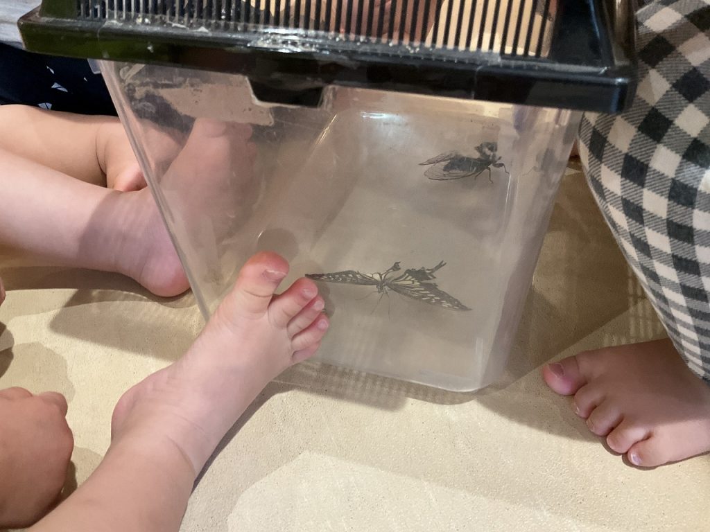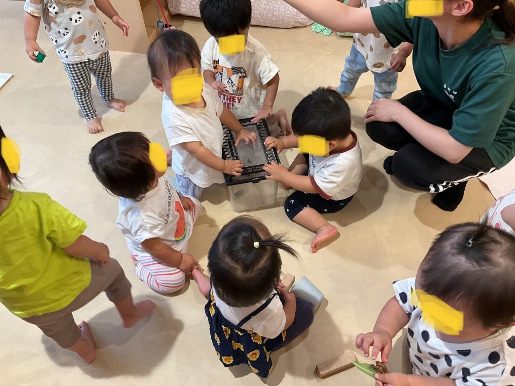 ちょうちょうの歌をうたったり、興味津々の子どもたちの前に、そっとセミを出してみると・・・ジーッ、ジーッと鳴きながら、お部屋の中を低空飛行!「おお~ッ‼」と声が上がるりすぐみさん。窓の近くでじっとしているセミに触ろうと近づく子や、遠くから見つめている子、それぞれの興味の形が面白かったです。