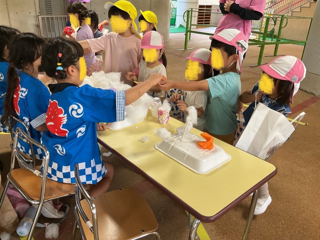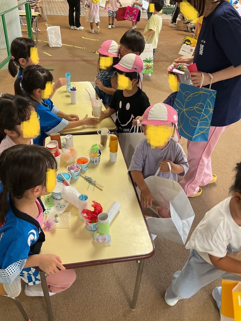 高槻双葉幼稚園のフレンズクラスさん主催の夏祭りに招待してもらいました。本当のお祭りのようにいろいろなお店屋さんがあって、とてもリアルに作られたかき氷、綿菓子、チョコバナナ、りんご飴、金魚すくい、スーパーボールすくい・・・等々、本当にワクワクするお祭りでした。