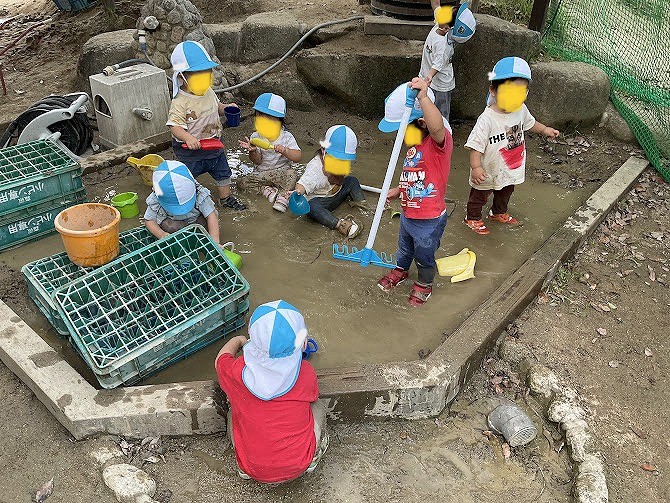 園庭の奥にあるどろんこ遊びコーナーは、りすぐみの子どもたちでいっぱいでした(笑)。お水大好き!ドロドロ大好き!汚れを気にせず、こんなにも遊び込める子どもたちが素敵です😊