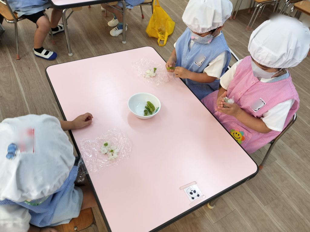 年中組は子ども用の包丁を使い、切りやすい形状と固さの食材を切り、年少組は手で割きやすい食材を手で割きました。