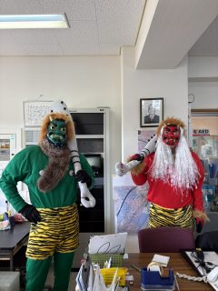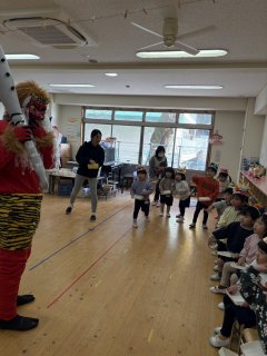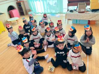 幼稚園では各学年お面や豆入れを作り、豆まきを楽しみました。