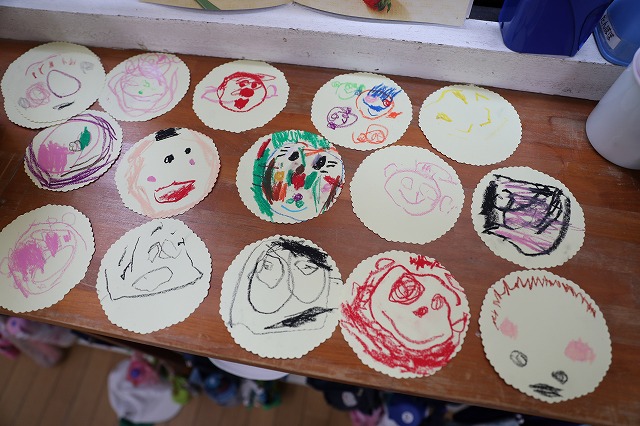 「ヒゲってどんなんだったかな?」「見て!帽子こんな形になった!」など友達同士で教え合ったり見せ合ったりして作っていました。