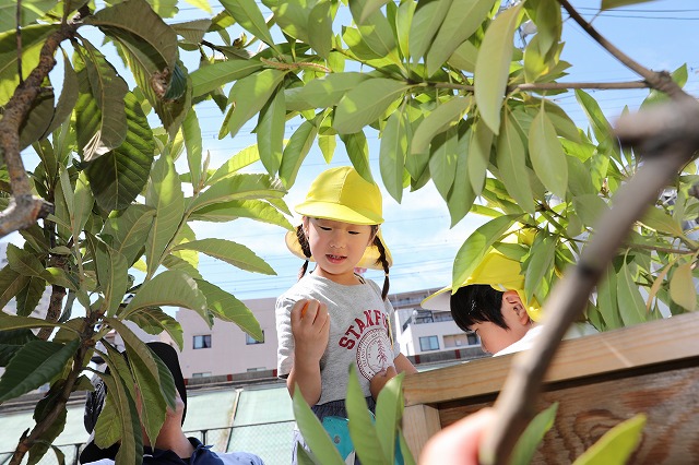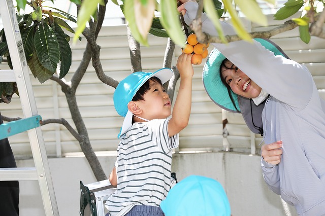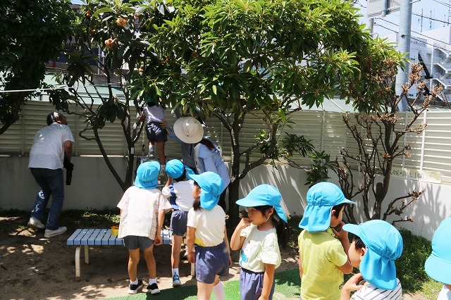 年長さんは脚立に乗って収穫しました。くるくると柿の実をもって回すと「プチン」ときれいに取れます。「獲れたー!」「結構重い!」など高いところにも関わらず嬉しそうに獲っていました。自分たち以外の分もたくさん収穫してくれました。