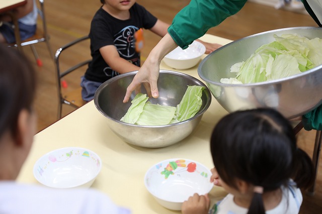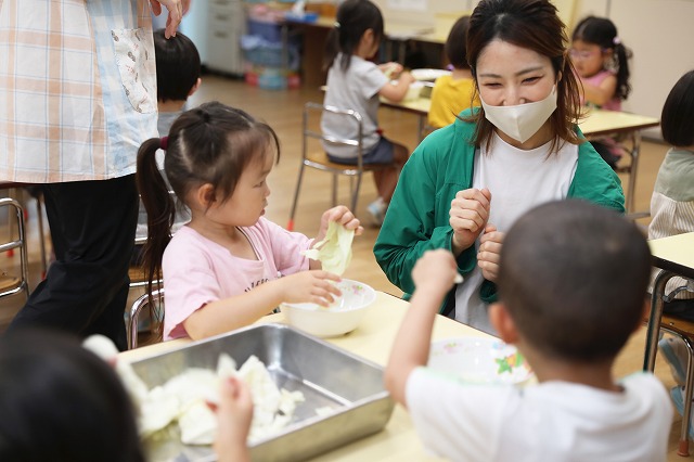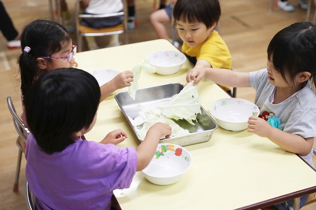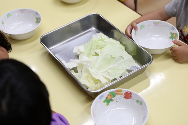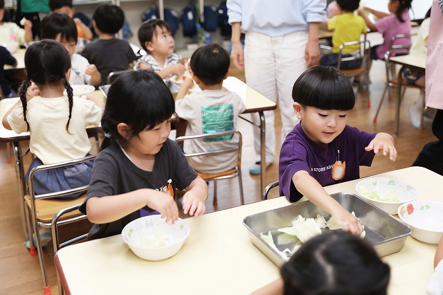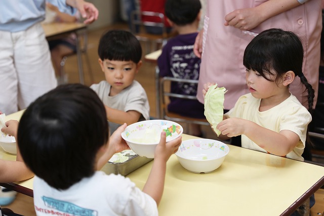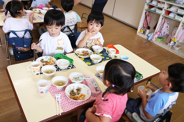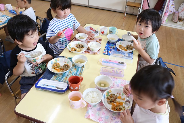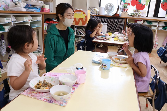 給食の時間には、たんぽぽ組さんとつくし組さん一緒に「いただきまーす」