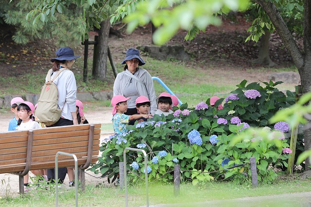 先週、ばら組さんともも組さんが西田公園へ行きました。先生たちの予想よりも上手に歩けていたので、今回は学級閉鎖になっていたふじ組さんも一緒に交通公園(久保公園)へ行くことになりました。