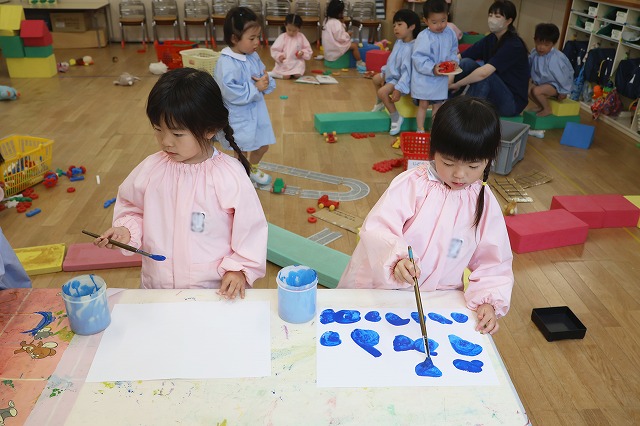 そして、先日は絵の具を使ってみました。2色の絵の具を使って画用紙いっぱいに絵の具の感触を楽しみました。初めて筆を使った子もいてクレパスと違った感触で楽しんでたくさんたくさん描いている子もいました。