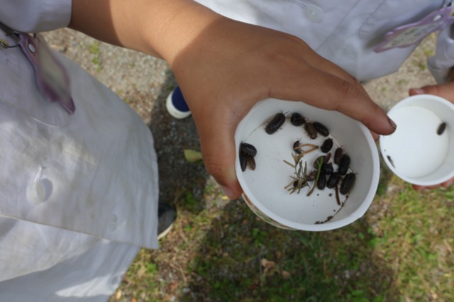 先生のお話を聞いて、1人1個のカップをもらって早速ダンゴムシ探し開始