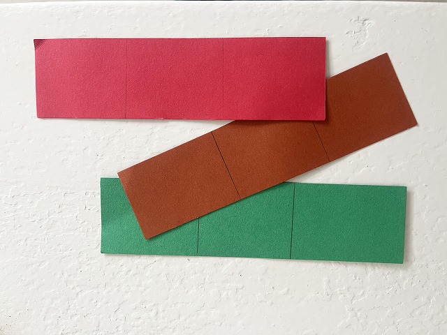 今日切るのは、赤・緑・茶色の長細い画用紙。