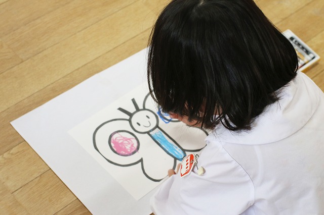 色を塗るのが楽しくていろいろな色を使ってみる子、色を考えながら塗る子、ダイナミックに塗り込む子・・それぞれ楽しんで塗っていました。