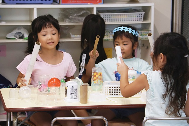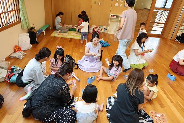 その後はみんな楽しみにしていたマラカス作り!それぞれ持って来た材料でお家の人とオリジナルのマラカスを作りました。完成したマラカスを振ってみると“シャンシャン”と素敵な音が♪嬉しそうにお家の方やお友達とならしている姿が見られました。