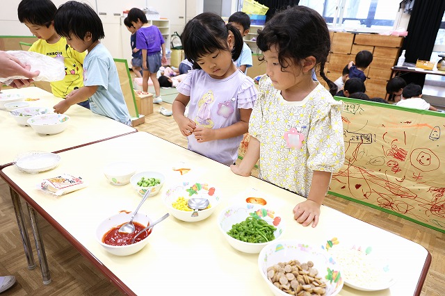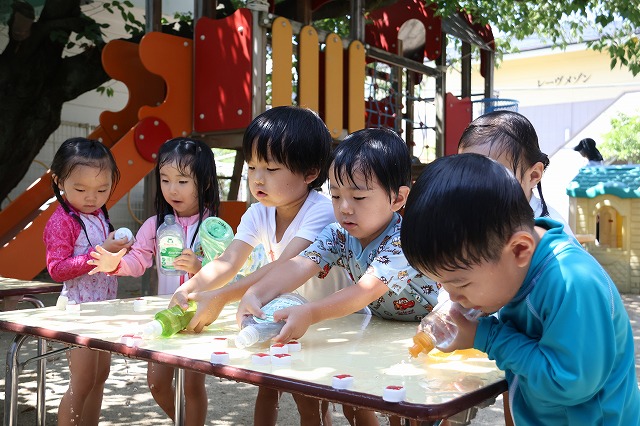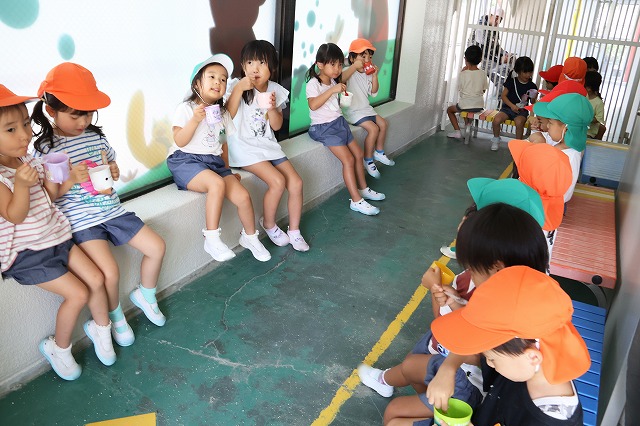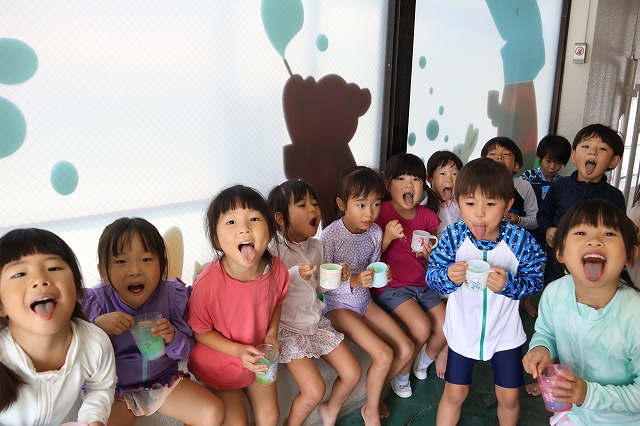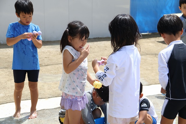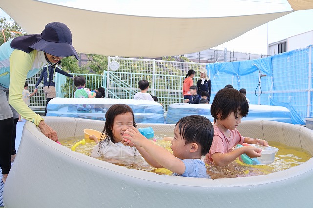 プールに入ったり、水風船や流しそうめんごっこ・的あて・水でっぽうなどなど少しずつ内容を変えながら水遊びをほぼ毎日のように行って、夏ならではの遊びや少しでも涼しさを感じられるようにしています。