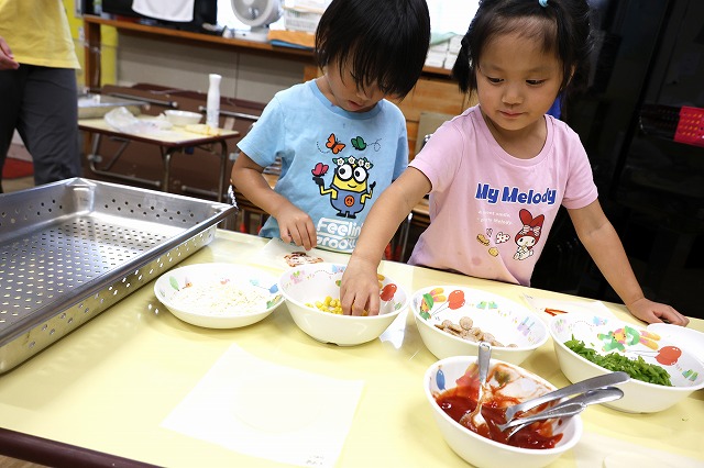 (チーズは豆乳でできたものなので、アレルギーの子も一緒に出来ました)給食室で焼いてもらうと・・皮がパリッパリになっておいしそう♪