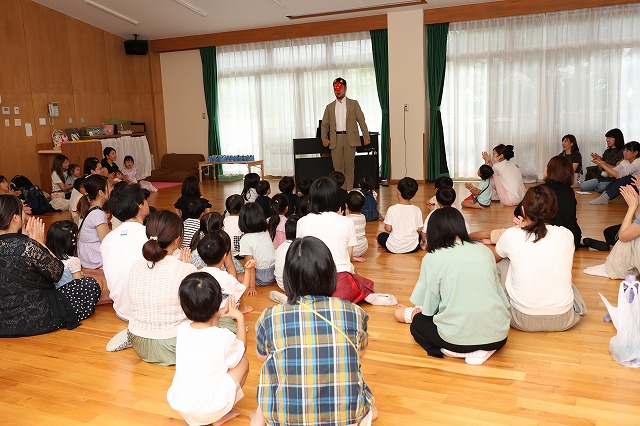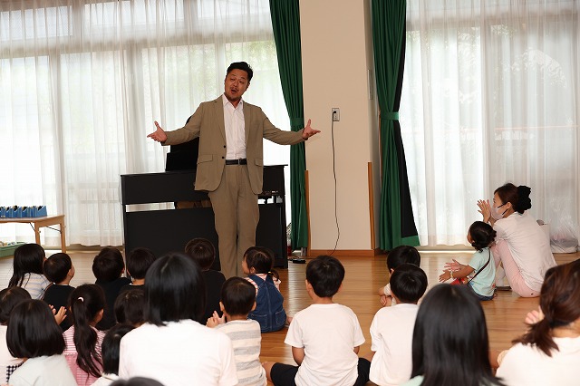 最初は童謡やクラシックのピアノのほっこりする演奏から始まり、歌のお兄さんの歌声と共に『鬼のパンツ』の手遊びをしたり、『しゅりけんにんじゃ』の曲で身体を動かしたり、手話を交えて『にじ』を歌ったりと、すてきな演奏と歌声に惹きつけられながら大人も子どもも一緒に楽しんでいました♪