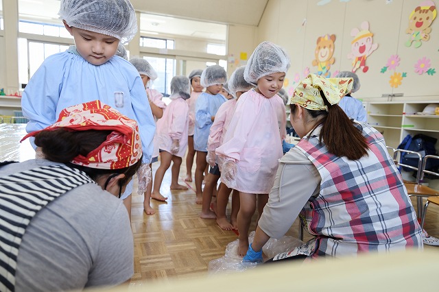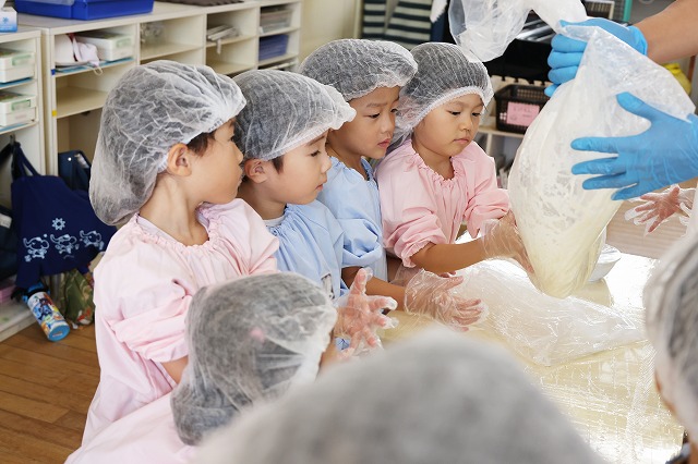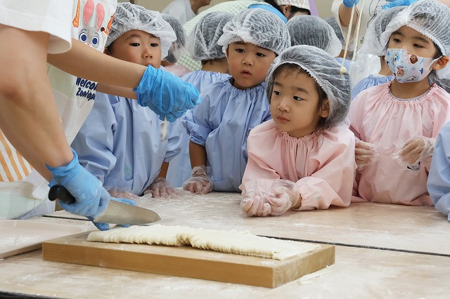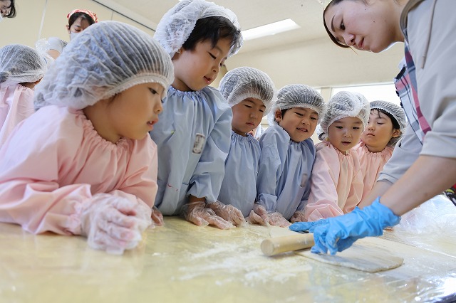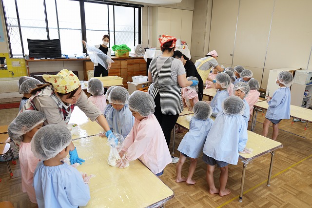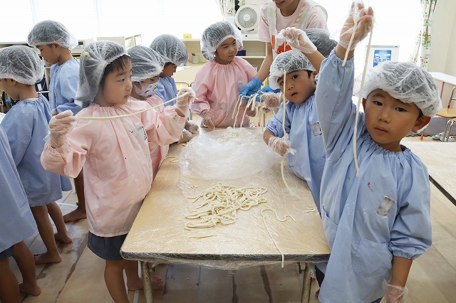 毎年恒例になりつつあるうどん作り。今年も年中組さんが行うことになりました。給食室(ハートスフードクリエーツ)の協力のもと行いました。