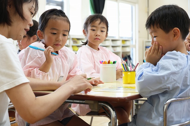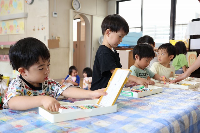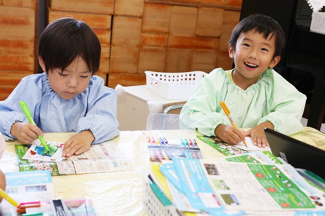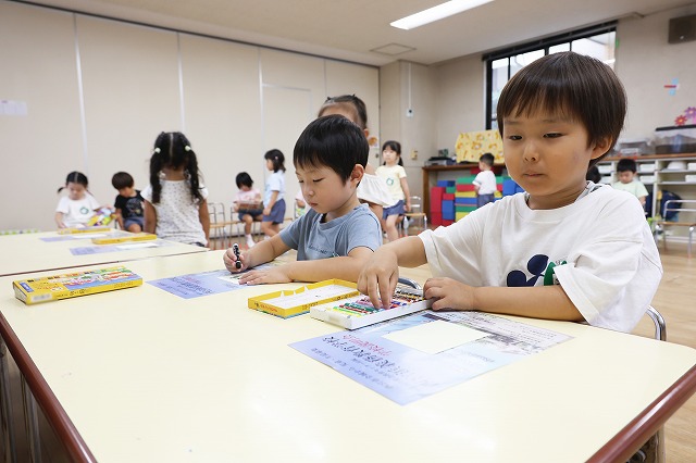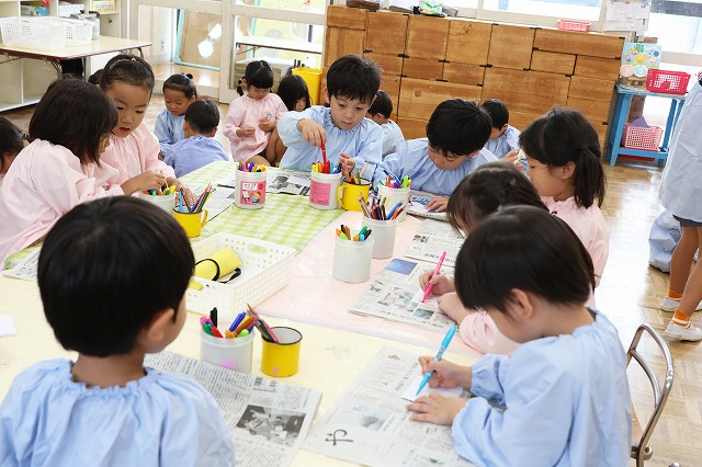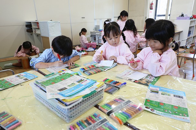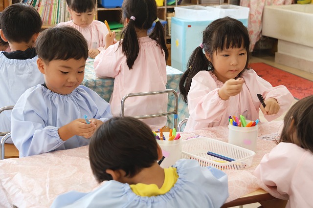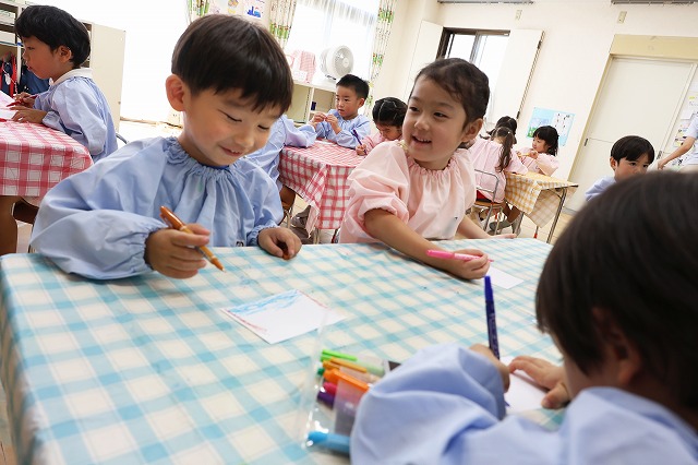 年中組さんは、自分が好きな遊びをおじいちゃん、おばあちゃんに教えてあげようと、好きな遊びをしているところをマーカーで描きました。