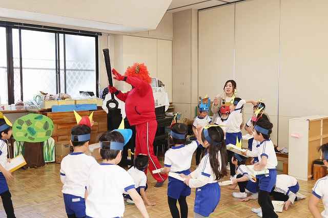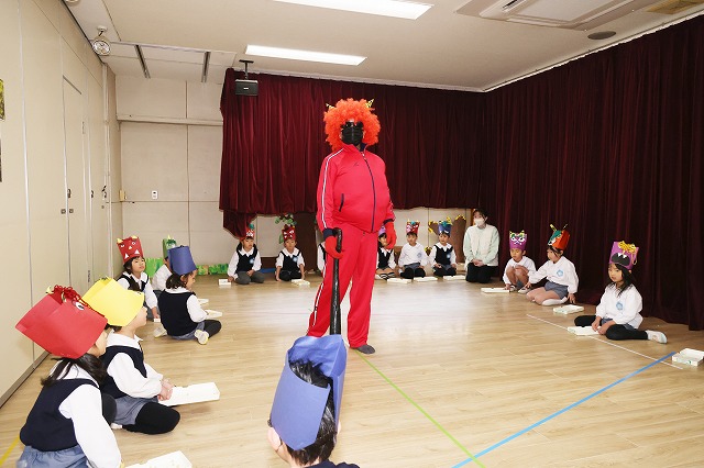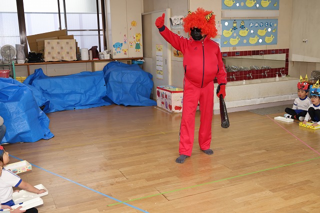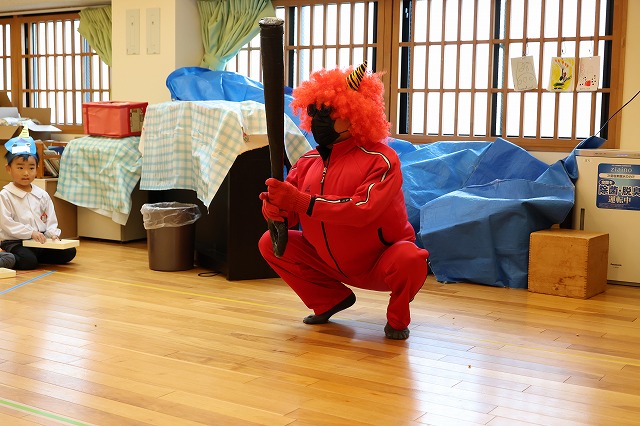 黒い金棒を持ち、下駄を履き、お腹が大きくふくらんだ強そうな赤鬼の登場に、年少組さんのお部屋では、少しこわばった表情になる子…泣き顔になる子…鬼さんについていく~と笑顔の子…様々な表情が見えました。